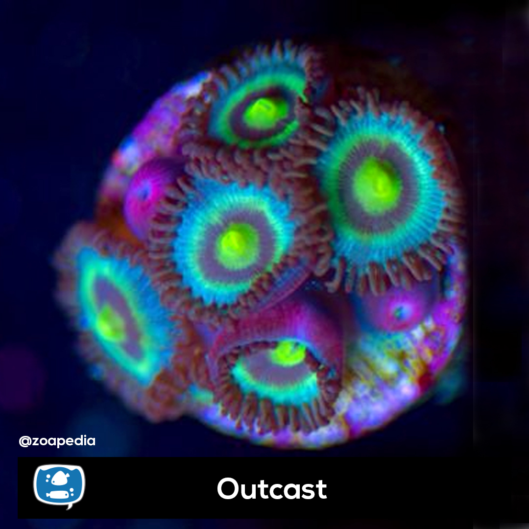 Outcast ├® um zoanthus. Suas cores incluem verde, roxo, azul, marrom.