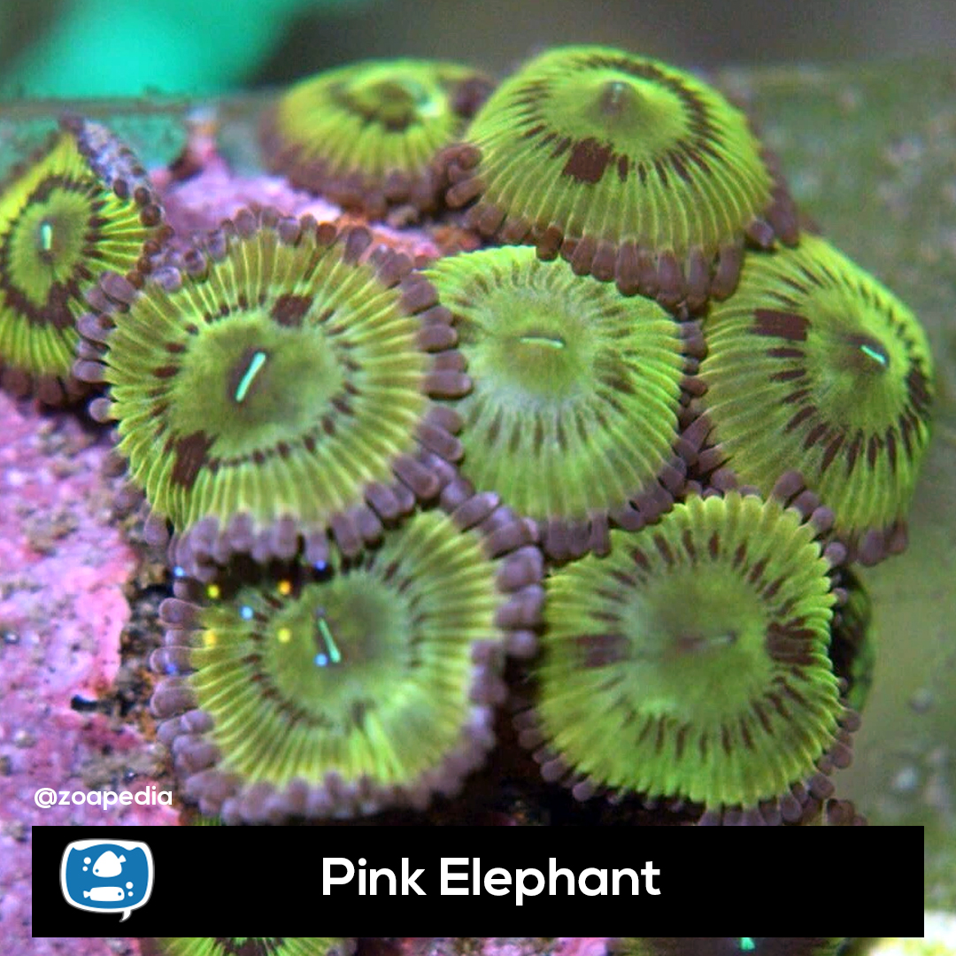 Pink Elephant ├® um zoanthus. Suas cores incluem verde, rosa.