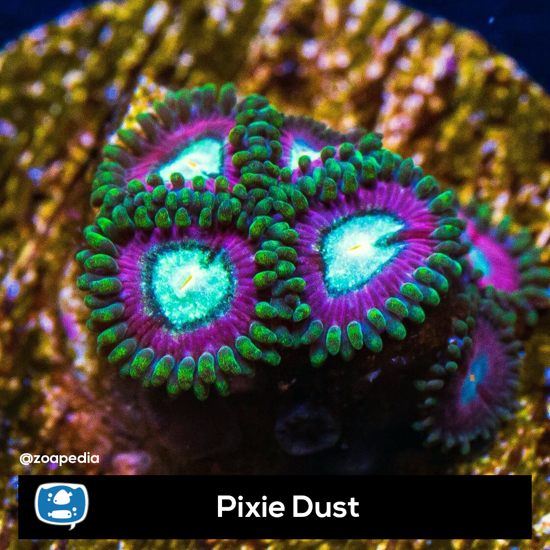 Pixie Dust ├® um zoanthus. Suas cores incluem verde, rosa.