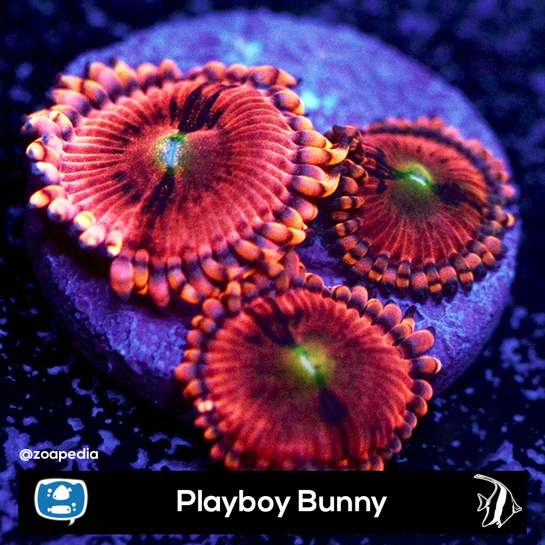 Playboy Bunny ├® um zoanthus. Suas cores incluem vermelho, preto, azul.