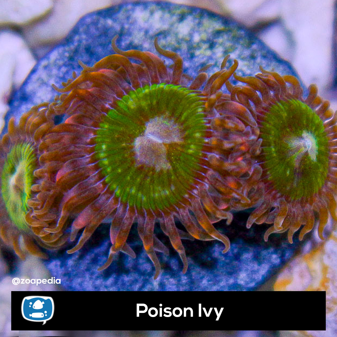 Poison Ivy ├® um zoanthus. Suas cores incluem branco, verde, laranja.