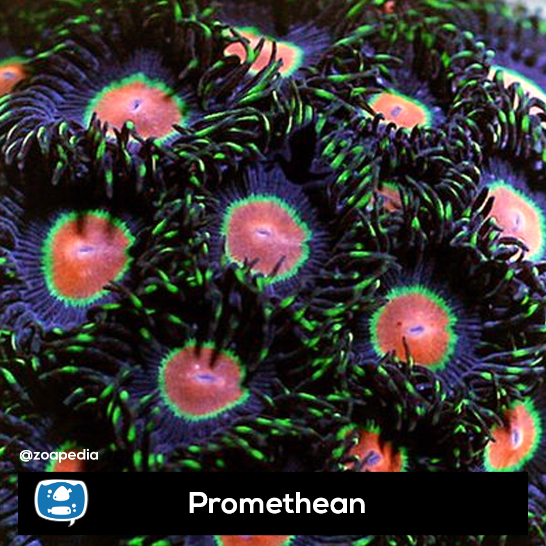 Promethean ├® um zoanthus. Suas cores incluem laranja, verde, roxo.