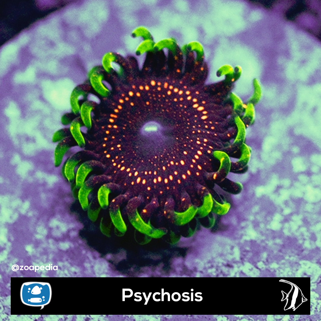 Psychosis ├® um zoanthus. Suas cores incluem roxo, laranja, verde.
