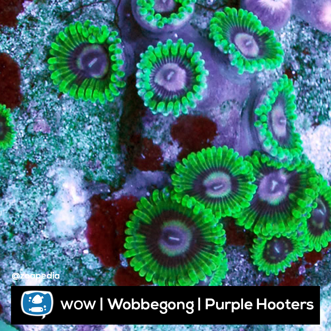 Purple Hooters ├® um zoanthus. Suas cores incluem roxo, rosa, verde.