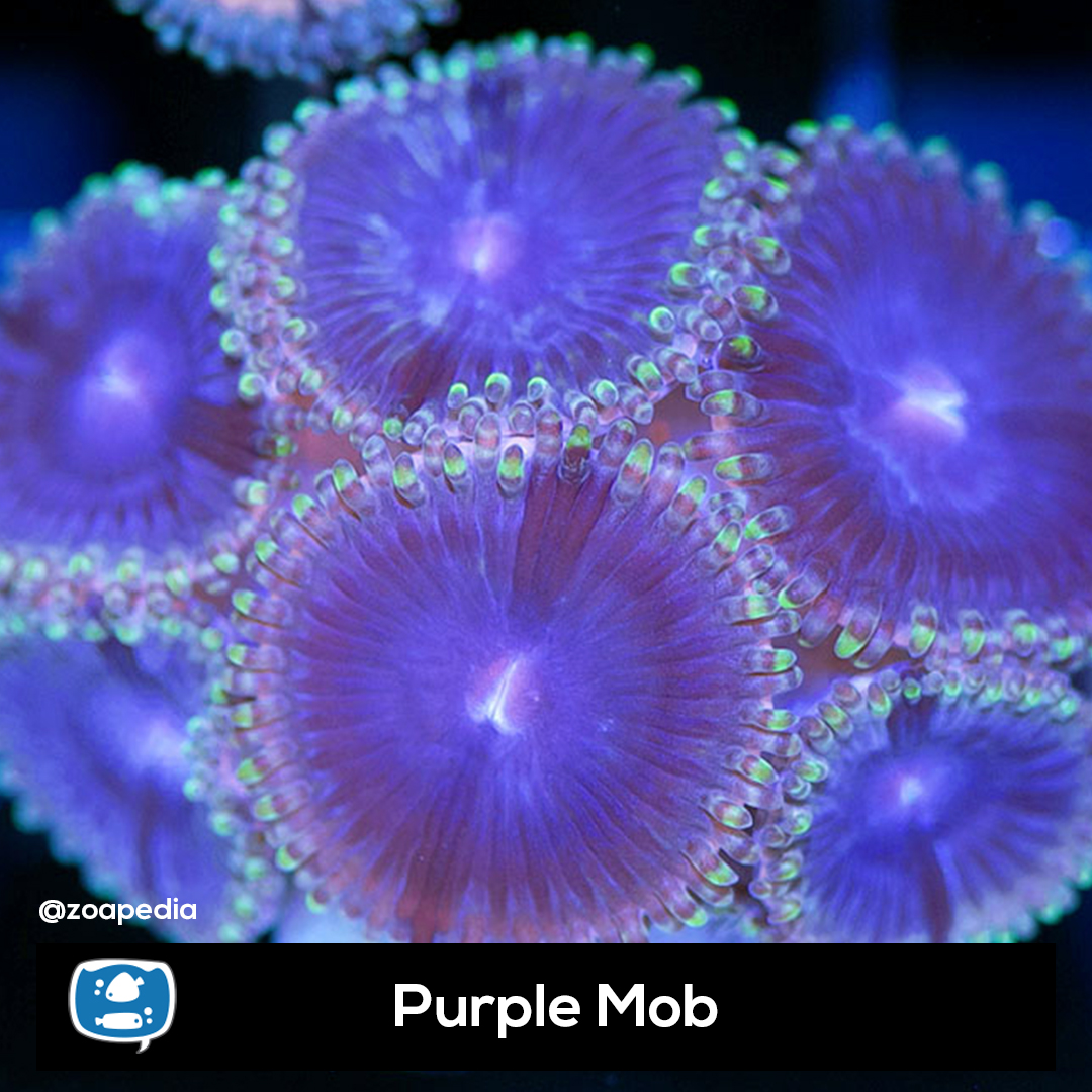 Purple Mob ├® um zoanthus. Suas cores incluem roxo, verde.