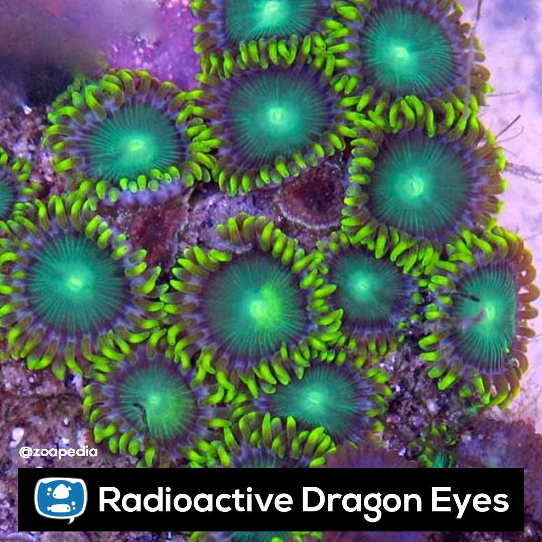Radioactive Dragon Eyes ├® um zoanthus. Suas cores incluem verde, roxo.