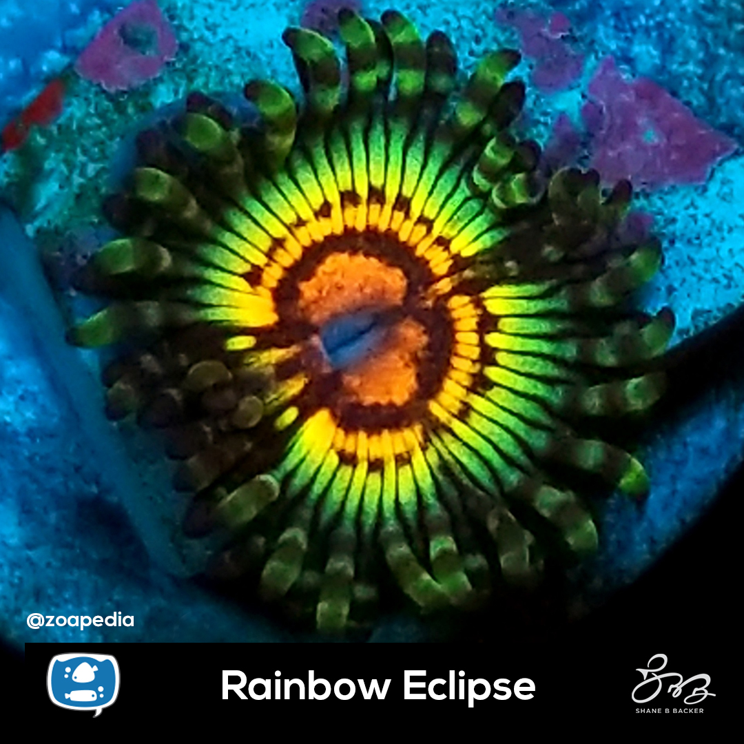 Rainbow Eclipse ├® um zoanthus. Suas cores incluem laranja, marrom, amarelo, verde.