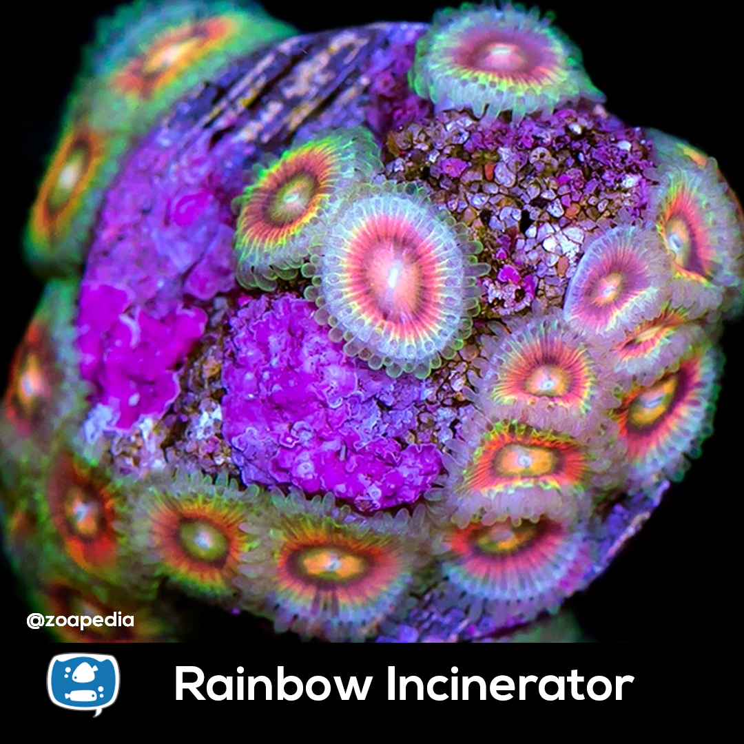 Rainbow Incinerator ├® um zoanthus. Suas cores incluem laranja, vermelho, amarelo, verde.