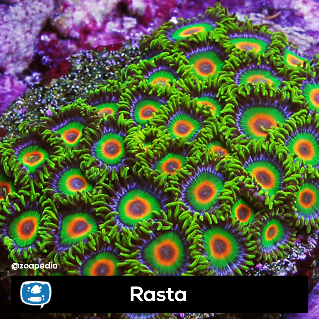 Rasta ├® um zoanthus. Suas cores incluem roxo, laranja, verde.