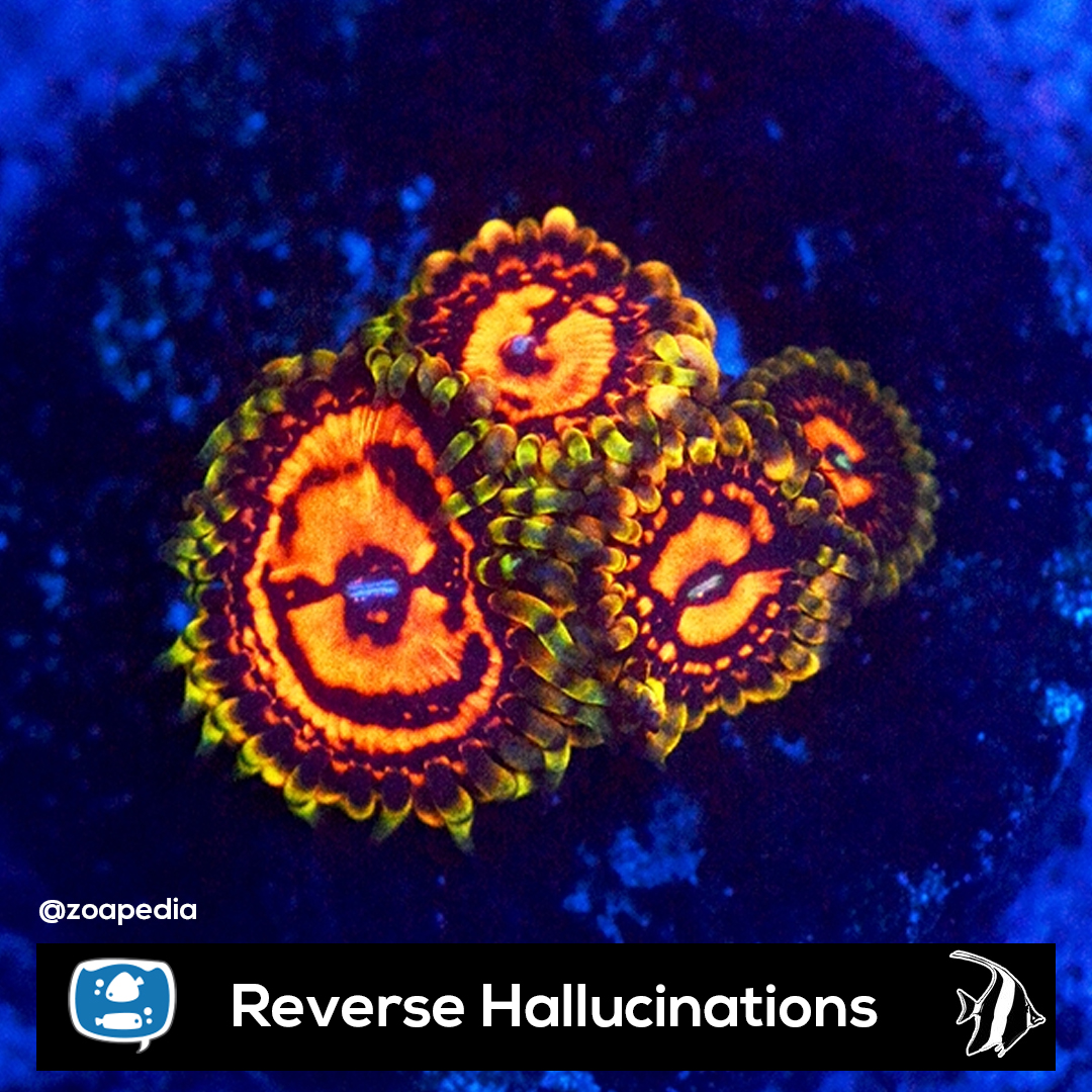 Reverse Hallucinations ├® um zoanthus. Suas cores incluem vermelho, laranja, amarelo.