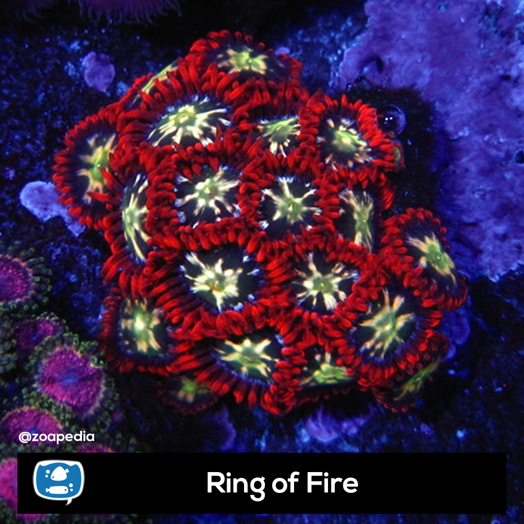 Ring of Fire ├® um zoanthus. Suas cores incluem verde, azul, vermelho.