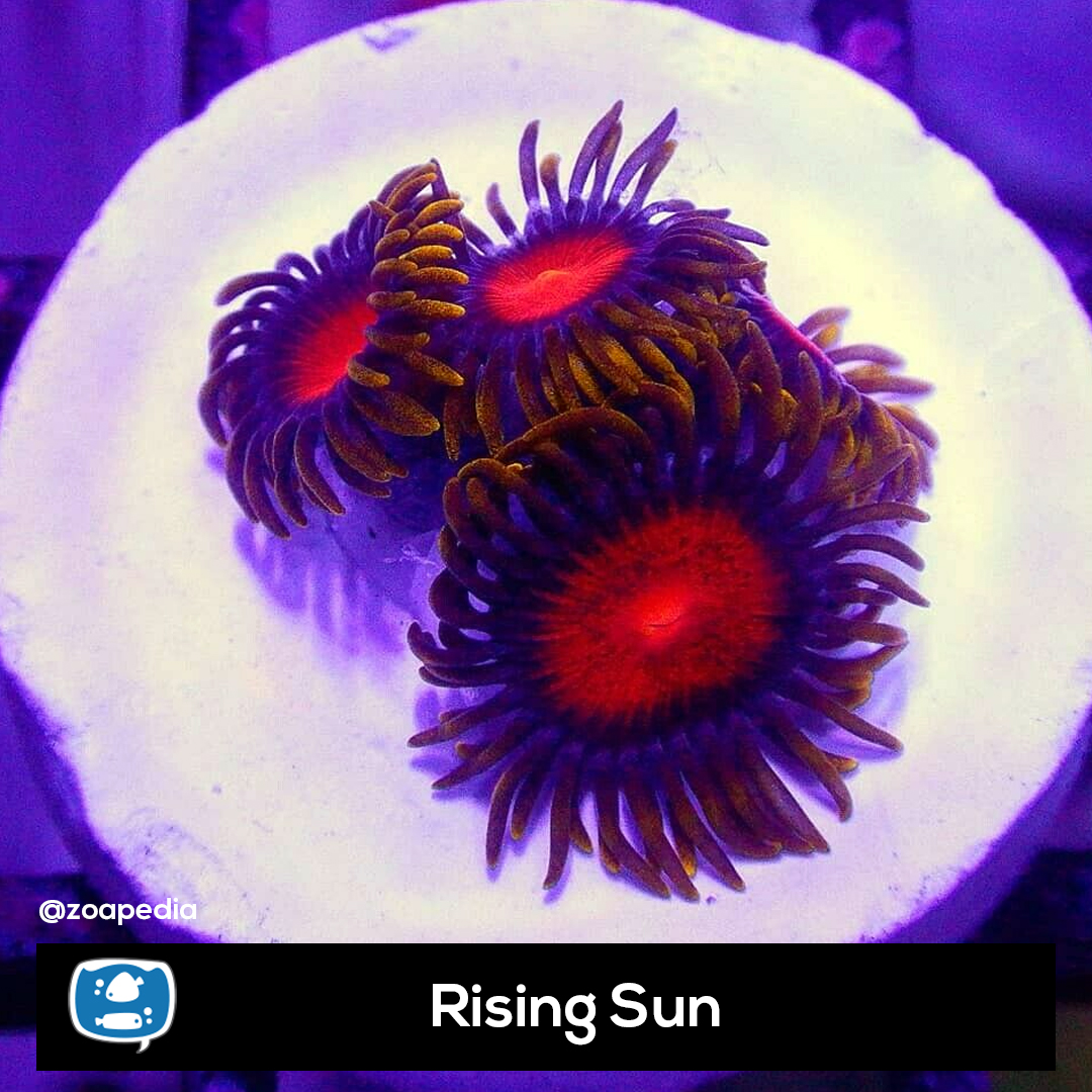 Rising Sun ├® um zoanthus. Suas cores incluem vermelho, roxo, amarelo.