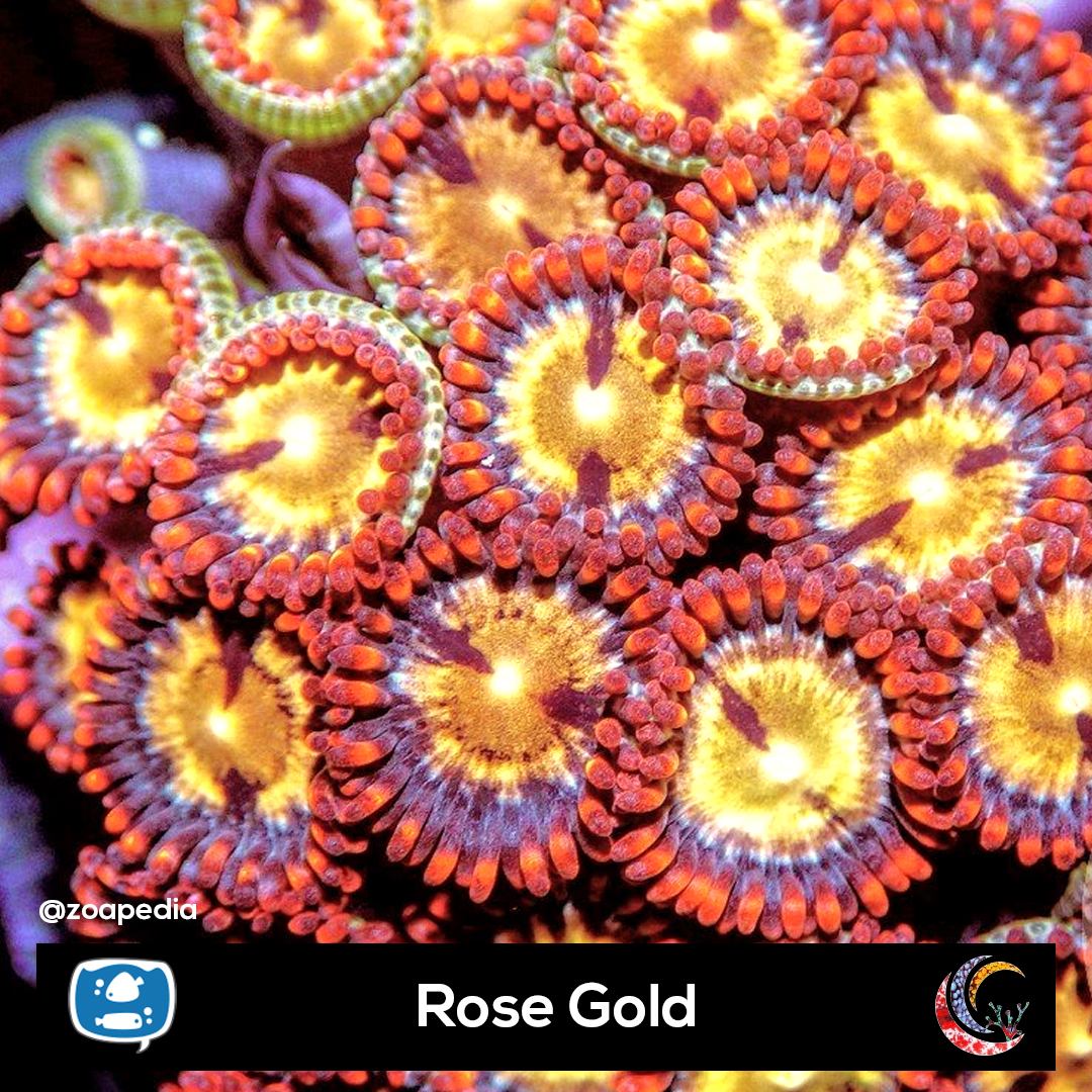 Rose Gold ├® um zoanthus. Suas cores incluem amarelo, azul, laranja.