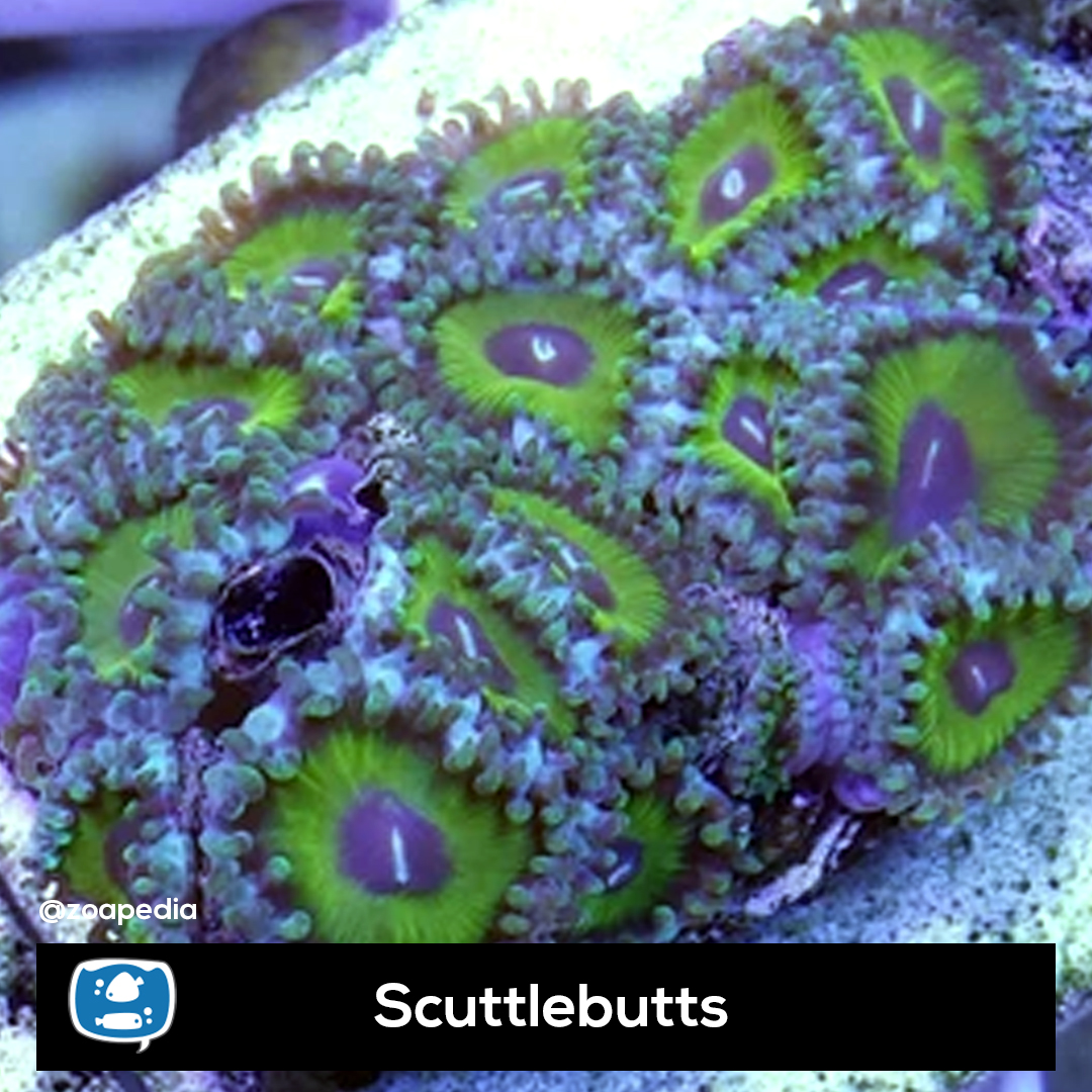 Scuttlebutts ├® um zoanthus. Suas cores incluem roxo, verde, azul.