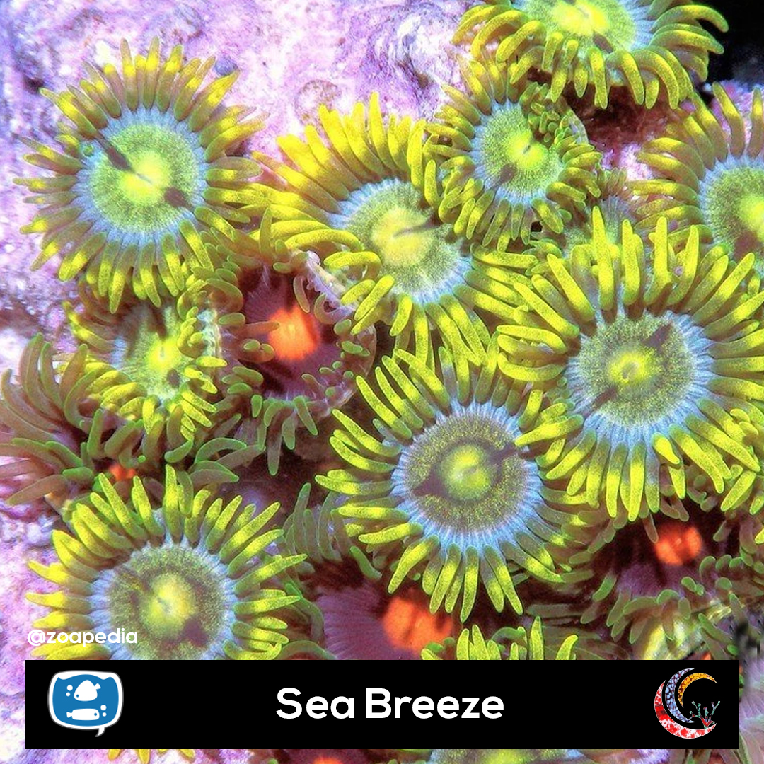 Sea Breeze ├® um zoanthus. Suas cores incluem verde, azul, amarelo.