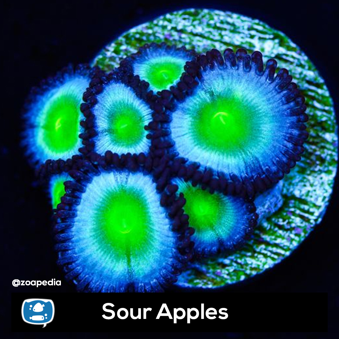 Sour Apples ├® um zoanthus. Suas cores incluem verde, azul.