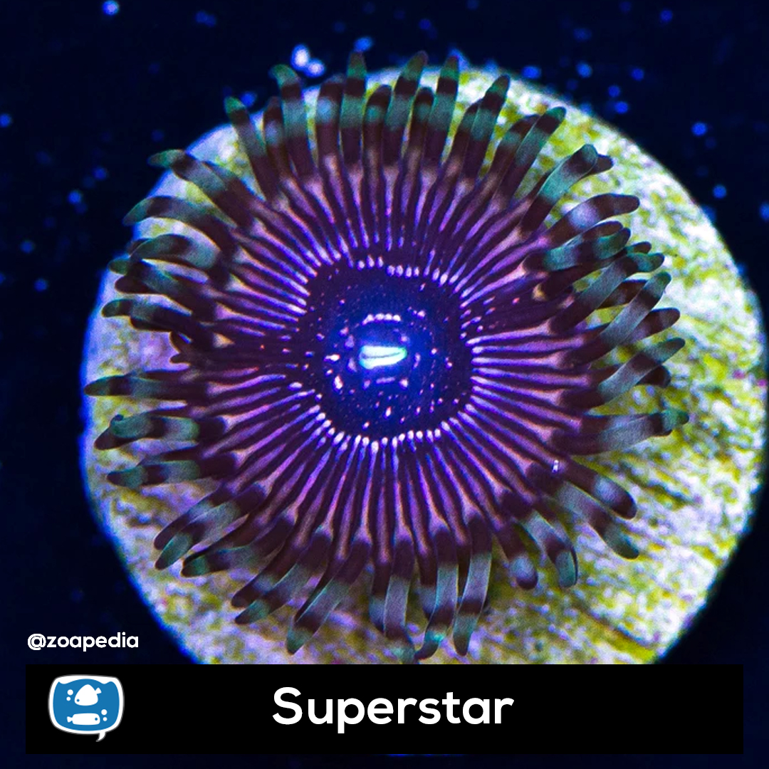 Superstar ├® um zoanthus. Suas cores incluem azul, roxo, multicolor.