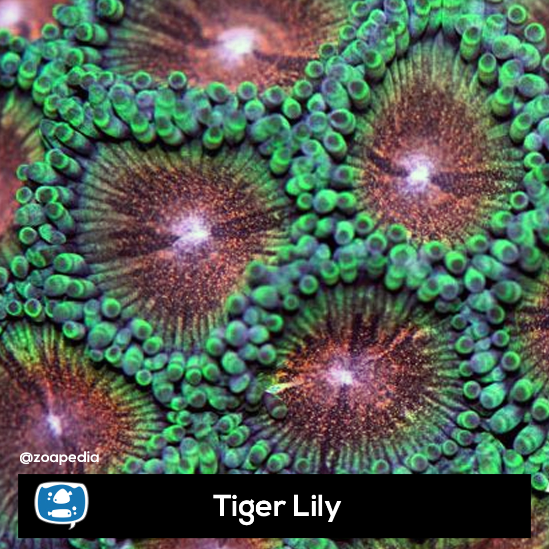 Tiger Lily ├® um zoanthus. Suas cores incluem vermelho, verde.