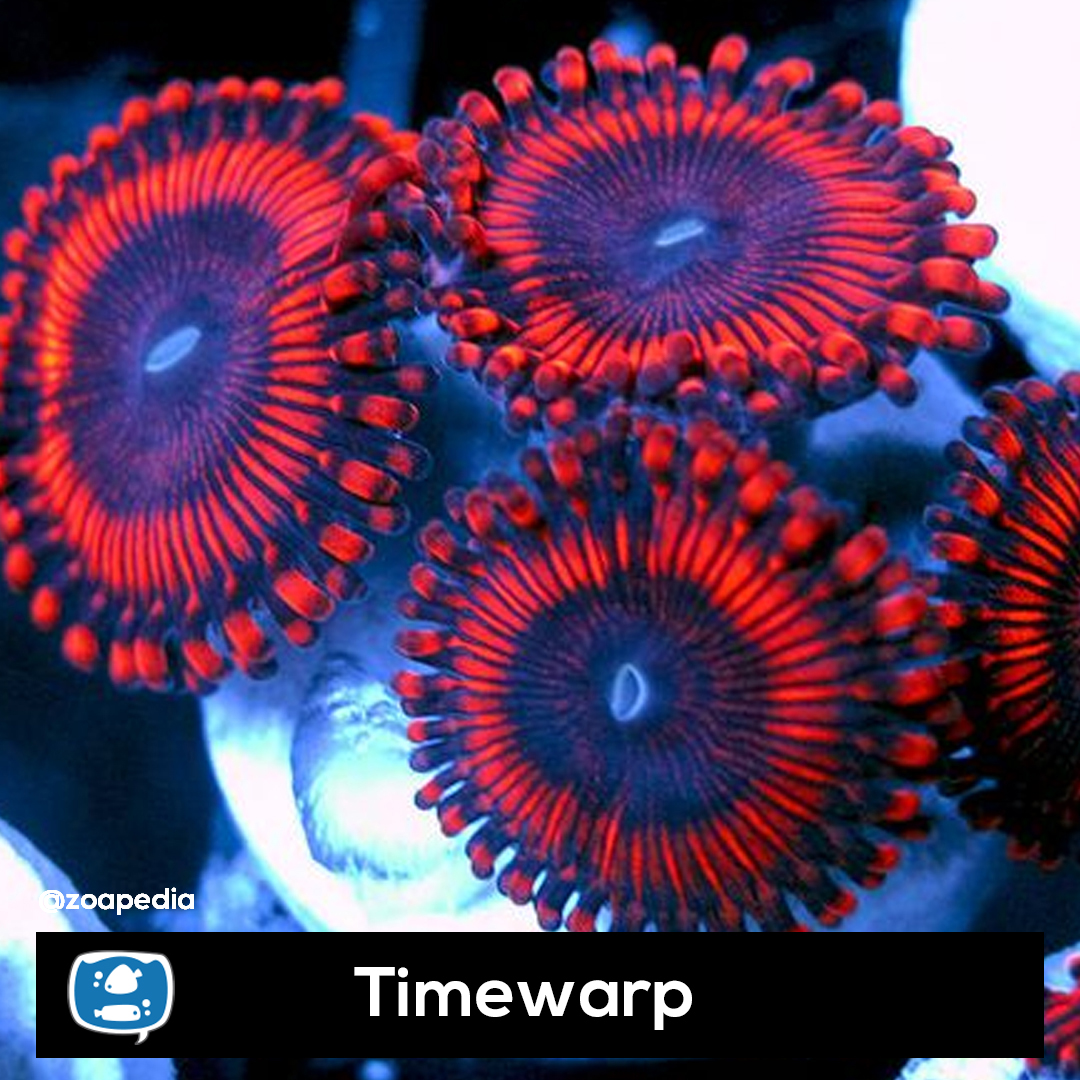 Timewarp ├® um palythoa. Suas cores incluem roxo, vermelho.