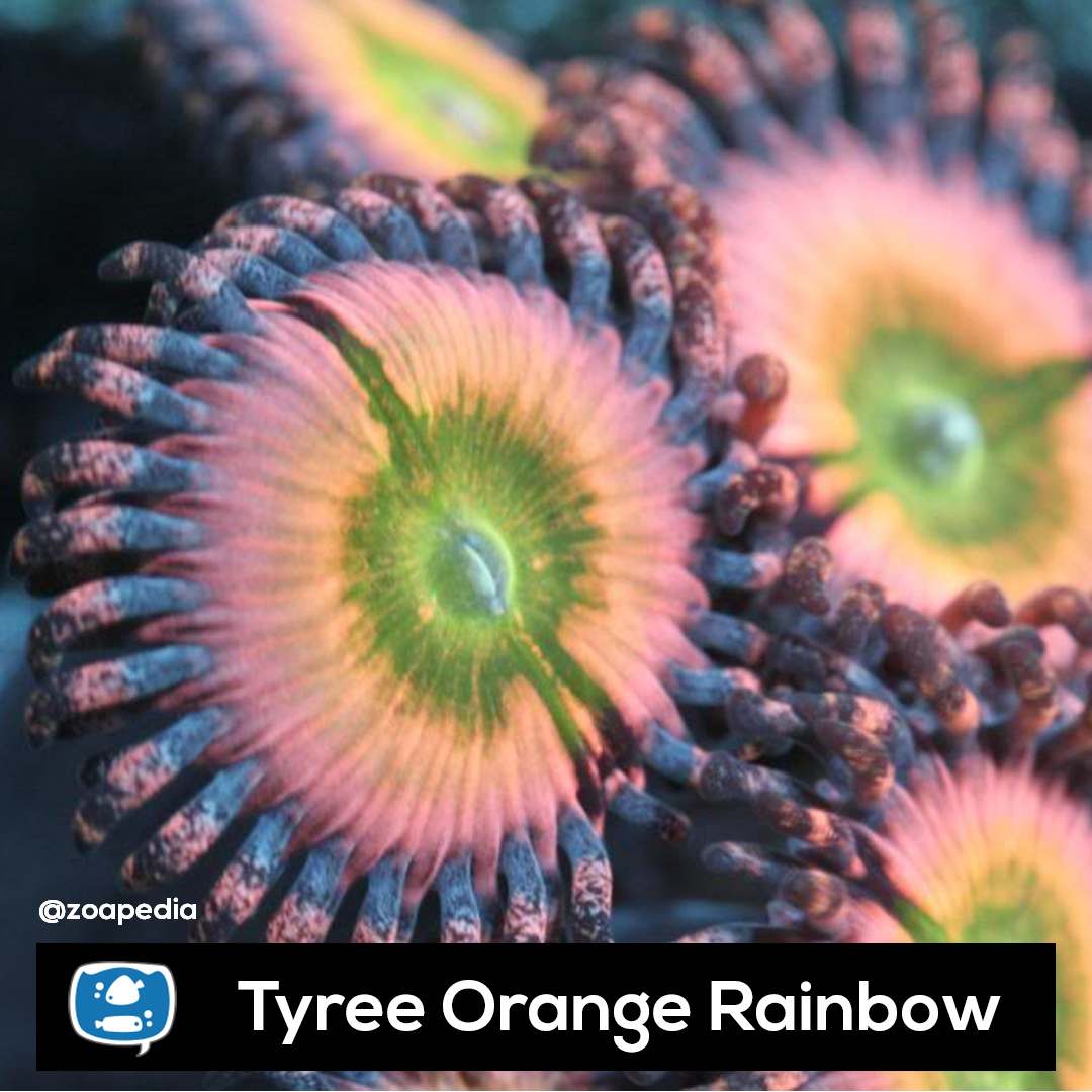 Tyree Orange Rainbow ├® um zoanthus. Suas cores incluem verde, laranja, multicolor.