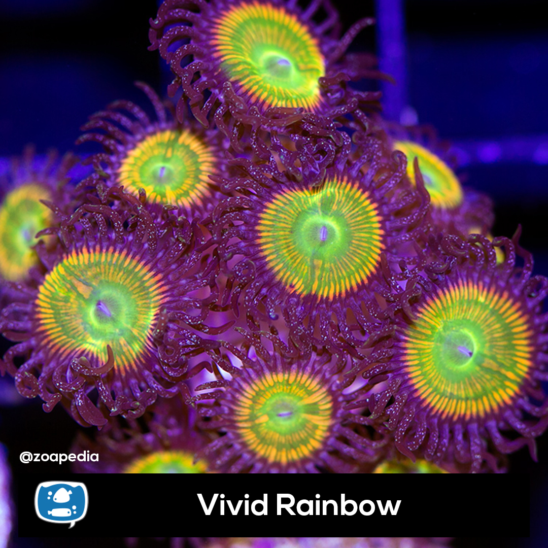 Vivid Rainbow ├® um zoanthus. Suas cores incluem verde, amarelo, roxo.